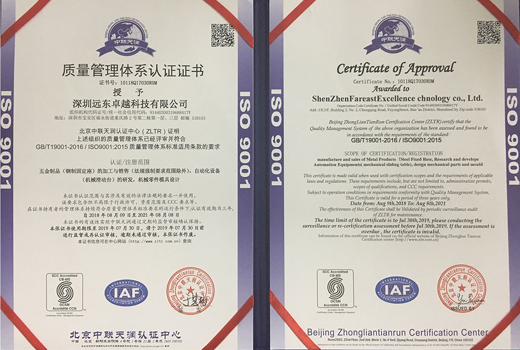 En 2015, nous avons obtenu la certification du système qualité ISO9001 et accéléré le rythme de développement de l'information. Afin d'améliorer la compétitivité de base de l'entreprise, l'entreprise a renforcé la gestion de la qualité, amélioré l'efficacité de l'entreprise, amélioré efficacement la méthode de contrôle de la qualité des processus, amélioré l'effet préventif du point de contrôle de la qualité et joué un rôle actif dans l'amélioration du contrôle de la qualité du processus et garantir la qualité des produits. Nous obtiendrons ISO 1400, ISO 13485 et IATF 16949 en mars 2022.